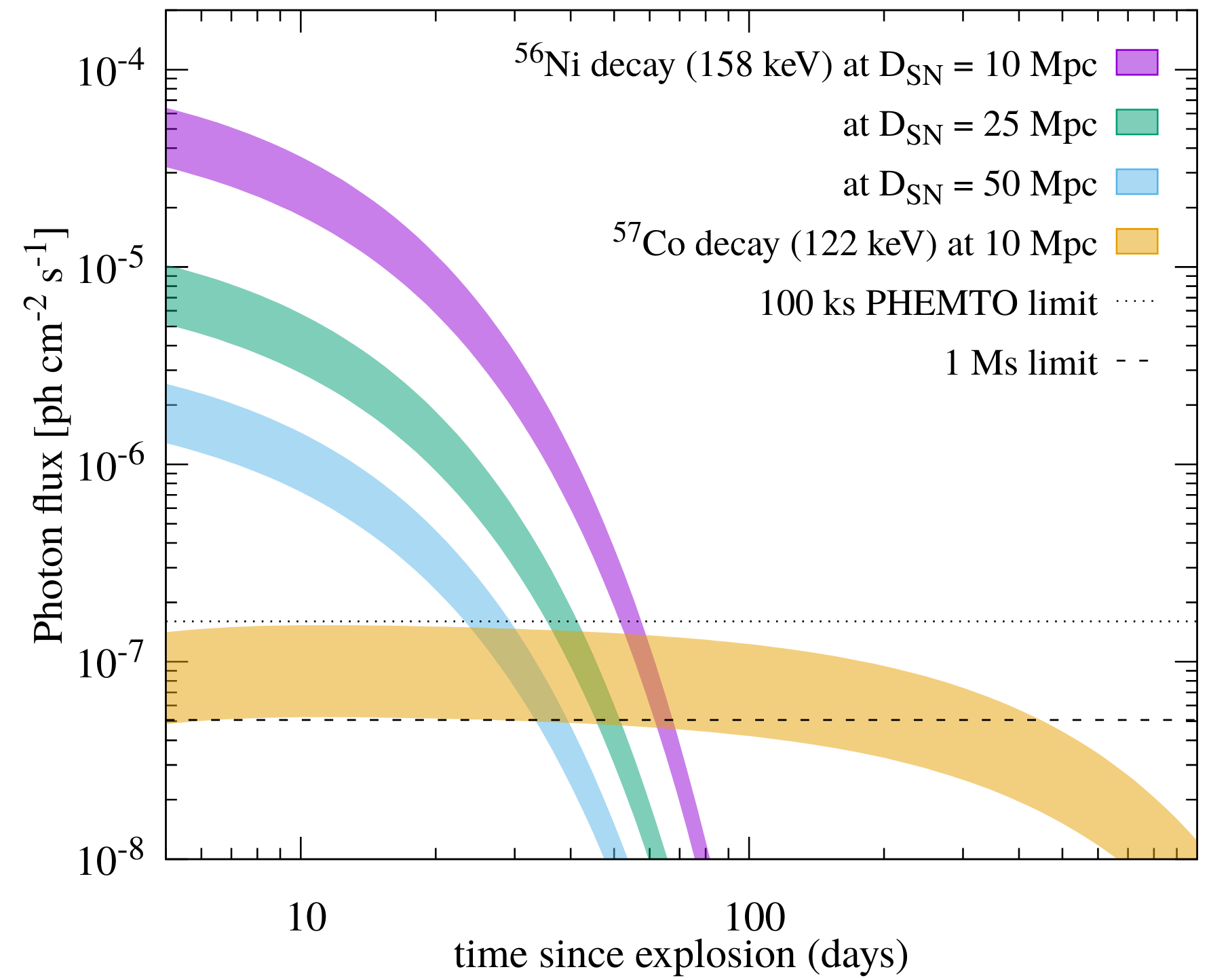 The optical light curve of supernovae (SNe) is powered by the decay of radionuclides synthesized at the nuclear burning front of SNe. Type Ia SNe, in particular, are the main source of Fe in the Universe, from the decay of their main product 56Ni to 56Co and 56Fe. The resulting nuclear lines and high-energy continuum emission provide the most direct measurement of the nickel mass of SNe Ia, an essential constraint of the progenitor channel of SN Ia [Maeda et al., 2012]. So far, only the nearest type Ia SN2014J has been detected via nuclear lines with INTEGRAL [Diehl et al., 2014]. As the 3D nature of the explosion and viewing angle affect the line detection and measurement of Ni production [Summa et al., 2013], a larger sample of SN Ia is needed. For this, PHEMTO’s three order of magnitude sensitivity improvement with respect to INTEGRAL IBIS will dramatically increase the detection horizon: At an anticipated line sensitivity of 2 × 10−7 ph cm−2 s−1 for 100 ks, the 158 keV 56Ni →56Co decay line can be observed routinely for SNe Ia within 50 Mpc (Fig. 2), or about one event per month. Furthermore, the mass of another nickel isotope (57Ni) can be observed from the 122 keV line of 57Co → 57Fe decay (t1/2 = 272 d). The ratio 57Ni/56Ni is sensitive to the physical conditions (central density and metallicity) of the exploding white dwarf [Leung and Nomoto, 2018]. For a SN Ia nearby (< 10 Mpc, about one event per mission lifetime), we will have the possibility to obtain the first ever direct measurement of 57Ni yield (Fig. 2). Coupled with high spectral resolution from NewAthena to measure the yields of 55Fe and neutron-rich species (Cr, Mn), we will be able to fully characterize the progenitor channel of type Ia SNe.